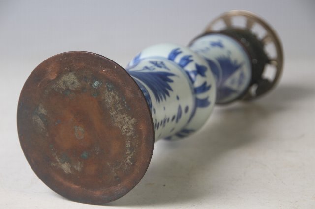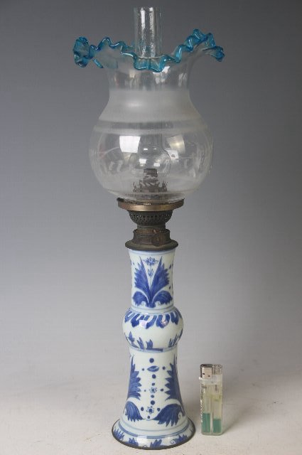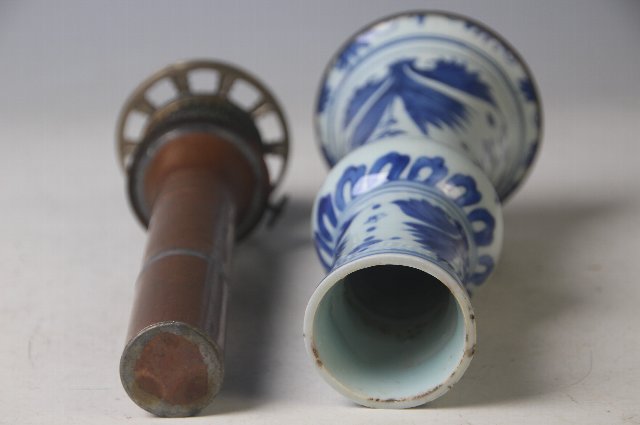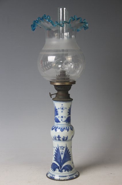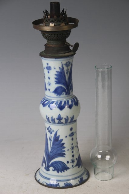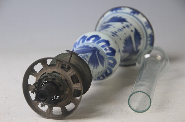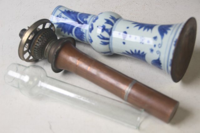 おそらく幕末期の伊万里花生けと思いますが、傷がいったのか、その品を加工してランプの台にしてあります。