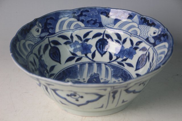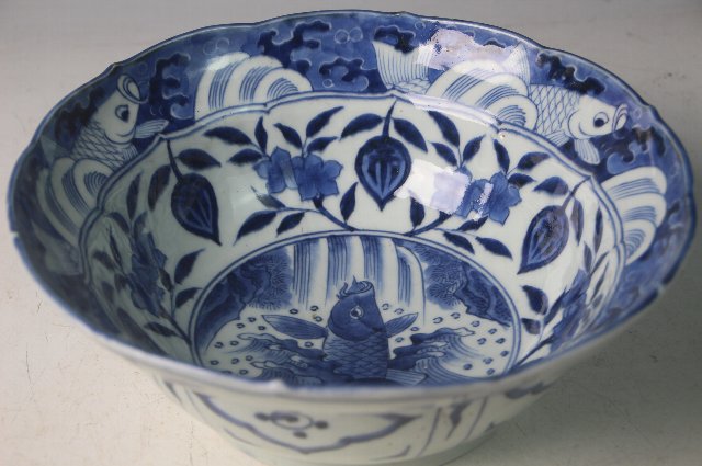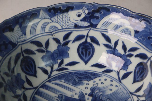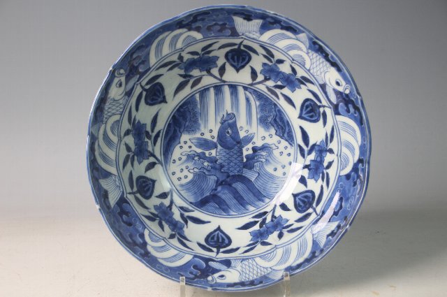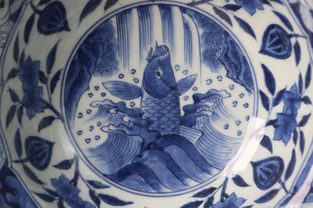周りに三匹の鯉が泳ぎ、見込みには滝登りする鯉が描かれています。
