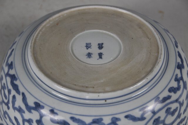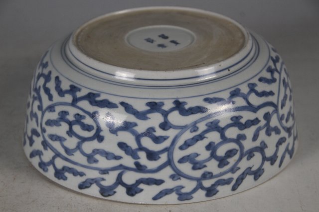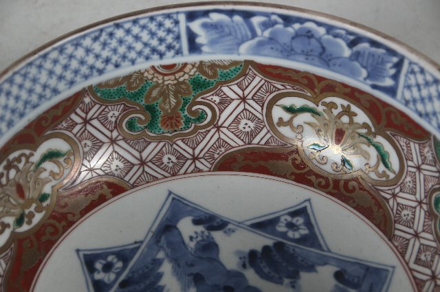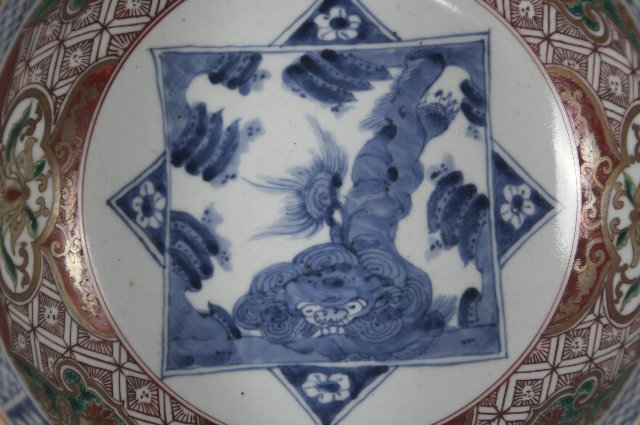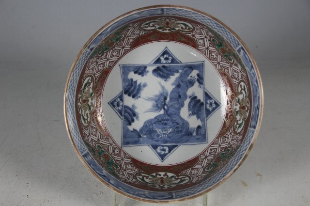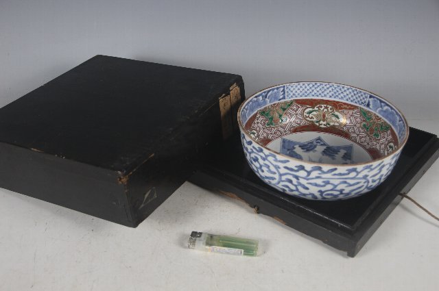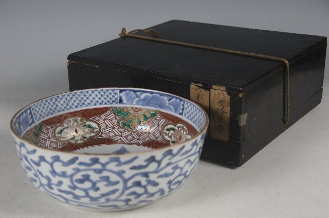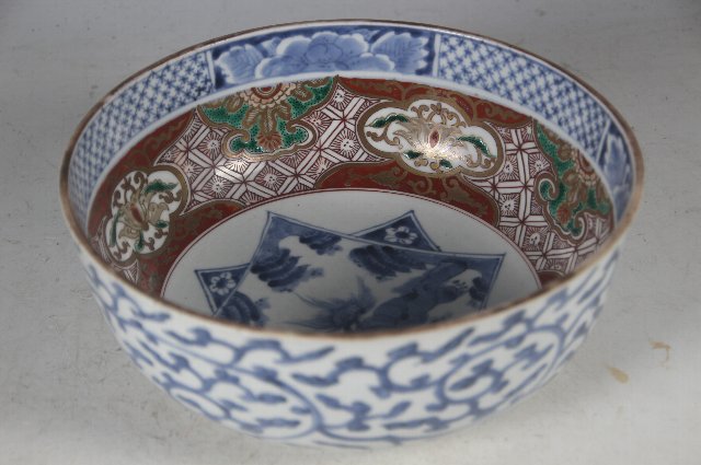 外側は太い唐草、内側は真ん中の帯の部分だけが錦手になった深い作りの鉢。